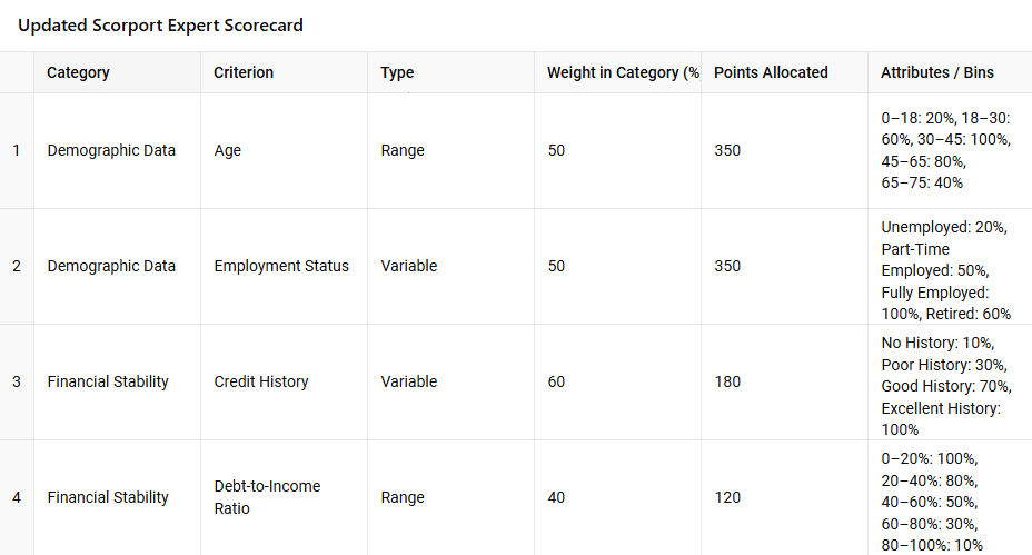 import ace_tools as tools; tools.display_dataframe_to_user(name="Scorport Expert Scorecard", dataframe=scorecard_df)